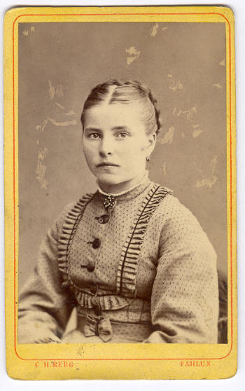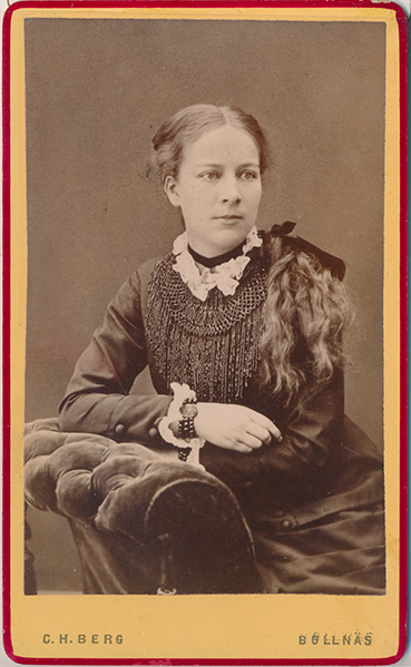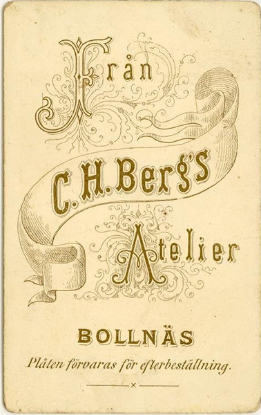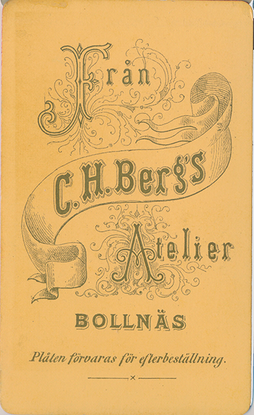 Kort av halvtjock kartong i svart färg med en tjock guldfärgad kant runt om samt runda hörn. Nedtill till vänster står texten “C.H. BERG och till höger “BOLLNÄS”. På baksidan finns texten “Från C.H. Bergs, Atelier, Bollnäs”. Bilderna består av albuminpapper. Kort nedan: Porträttfynd Nr. 122900.