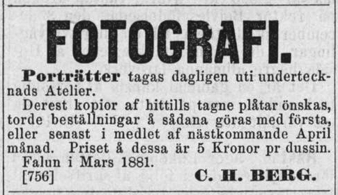 Carl Henrik tog över fotografen C. E. Källströms ateljé på Åsgatan i början på 1871 efter att tidigare varit anställd där (Dalpilen 1871-02-25). I den långa annonsen skrev han att han den sista tiden hos Källström arbetat där ensam. På tidiga visitkort står på baksidan också texten “C. H. Berg, C. E. Källströms Atelier, Fahlun”.