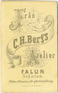 Kort av tunn kartong i vit, elfenbensvit eller gulaktig färg och raka hörn. En bit in från kanten löper en bård. Nedtill till höger står texten “C. H. Berg Fahlun”. På baksidan står texten ”Af C. H.Berg C. E. Källströms Atelier i Fahlun”. Bilderna består av albuminpapper. Kort nedan: Porträttfynd Nr. 157093 och Nr. 161820.