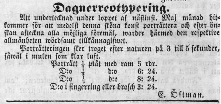 E. Östman annons i Norrlandsposten den 24 maj 1860.