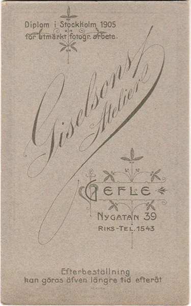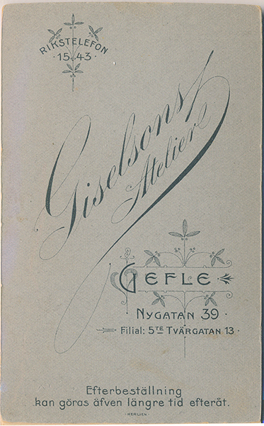 Giselsons Atelier visitkort Gefle, bak (P411_0002A).