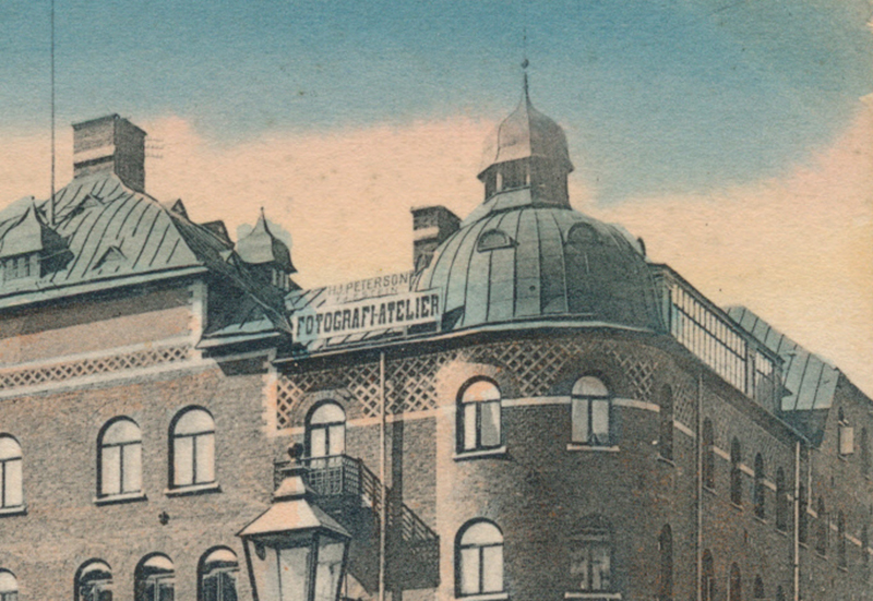 Fönstren till ateljén i Centralpalatset syns till höger i bild. Detalj av vykort från 1919 då ateljén innehades av fotografen Hj. Petterson.
