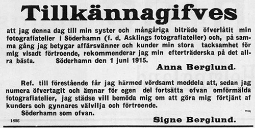 Anna Berglund och Signe Berglund annons i Söderhamns Tidning 1915-06-02 .