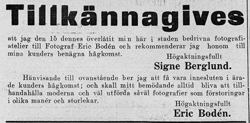 Signe Berglund och Erik Bodén annons i Söderhamns Tidning 1922-03-22.